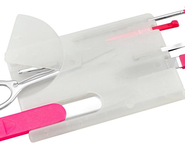 Set de Manicure Card Tool 8-en-1. Tamaño tarjeta de crédito. Incluye Bolígrafo, Mondadientes, Tijeras, Pinzas, Lima de Uñas, Cuchillo, Alfiler y Regla de 3″.