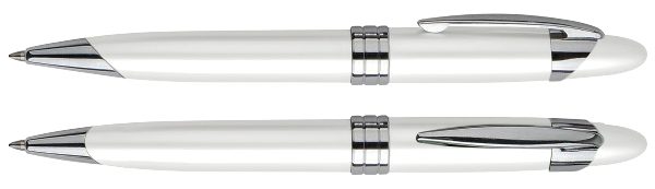 Bolígrafo metálico modelo «White Pearl», con terminales cromados plata. Escritura azul.