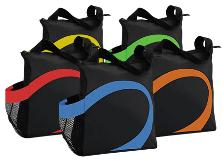 Cooler modelo «Wave». Tela exterior Polyester 70D/PVC. Tela interior plateada aislante 15C PEVA + relleno 3mm esponja PE. Cierre cremallera superior. Incluye bolsillo lateral en tela malla.