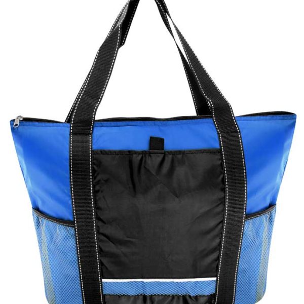 Cooler gigante modelo «Artic». Tela exterior Polyester 210D/PU. Tela interior plateada aislante 15C PEVA + relleno 6mm esponja PE. Cierre cremallera superior. Incluye bolsillo delantero para bordar + bolsillos laterales tela malla.