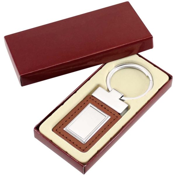 Llavero de Cuero Café con ventana rectangular metálica. Presentación en estuche laminado café con cuna aterciopelada.