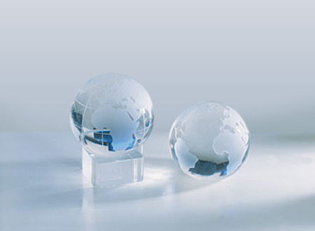 Mini Trofeo de Cristal modelo «World». Presentación en caja de cartón forrado negro.