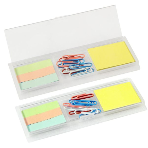 Porta Post-it con Clips de colores. Incluye 1 taco post-it de 40 hojas de 4,8 x 3,6 cm + 3 tacos de 25 banderitas post-it de 4,8 x 1,2 cm + 10 clips recubiertos de colores. Regla de 14 cm y de 5,5″.
