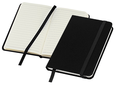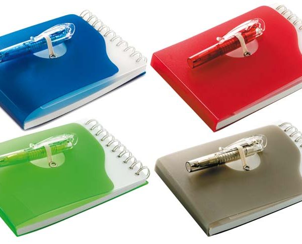 Libreta de Apuntes 68 hojas, con Bolígrafo 8 cm incluido. Tapa y contratapa plásticas rígidas en colores empavonados.