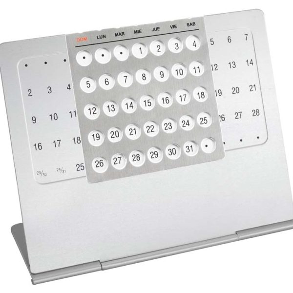 Calendario Eterno Metálico de escritorio, para todos los días, meses y años. Con ventana semanal móvil en español. Presentación en cajita plateada de regalo.