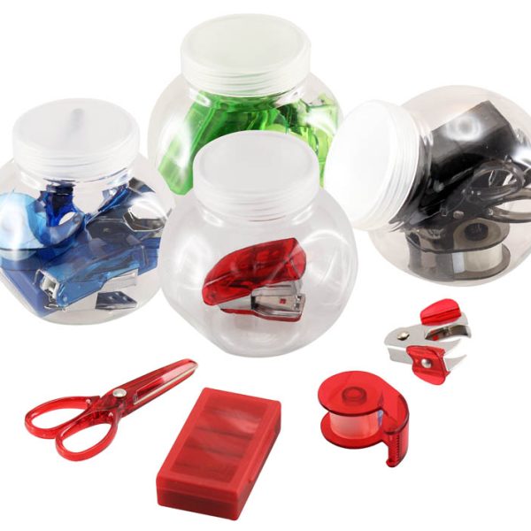 Set de oficina en frasco plástico transparente con tapa frozen. Ideal espacio para logo en tapa.