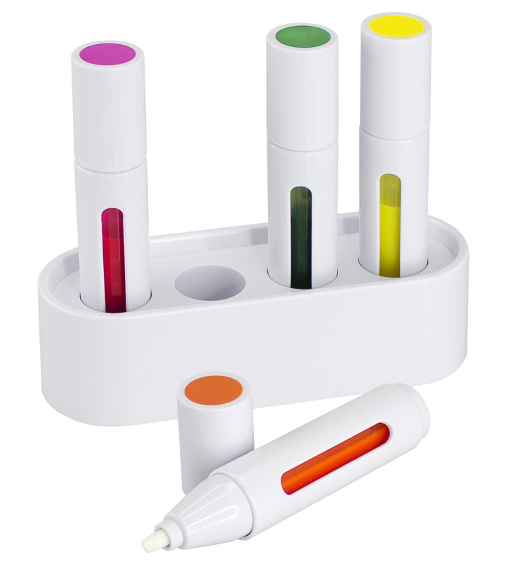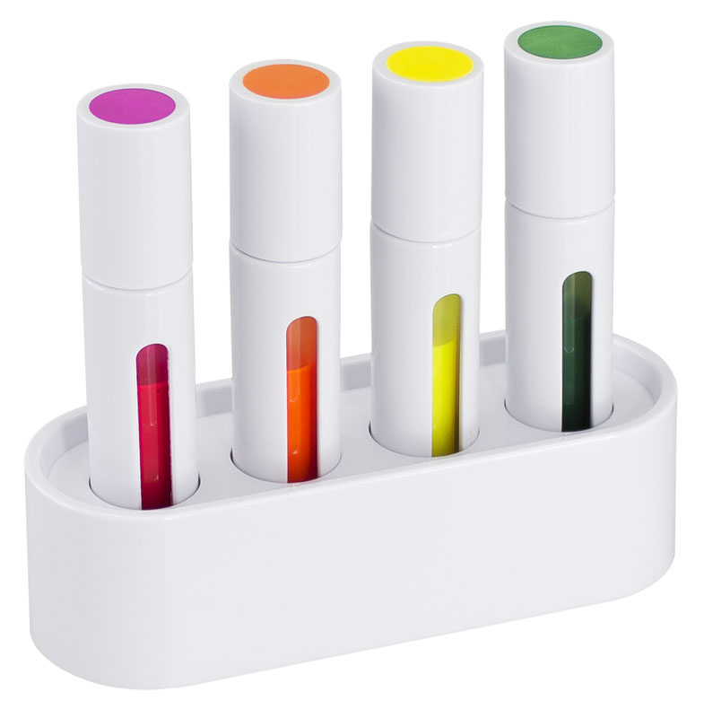Set de 4 Destacadores Líquidos con punta de fieltro. Almacenamiento del líquido en el cuerpo del destacador, lo que evita el secado rápido de la punta de fieltro. Presentación en contenedor plástico blanco.