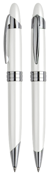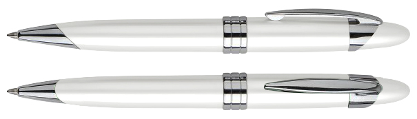 Bolígrafo metálico modelo «White Pearl», con terminales cromados plata. Escritura azul.
